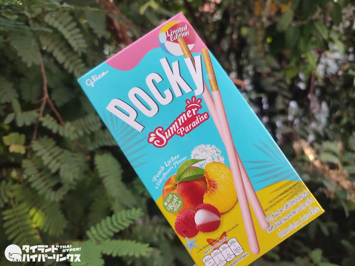 そんな中で発売されたのはポッキー「サマーパラダイス(Summer Paradise)」。暑さを跳ね返す(?)ピーチとライチとエルダーフラワー風味のポッキーです!