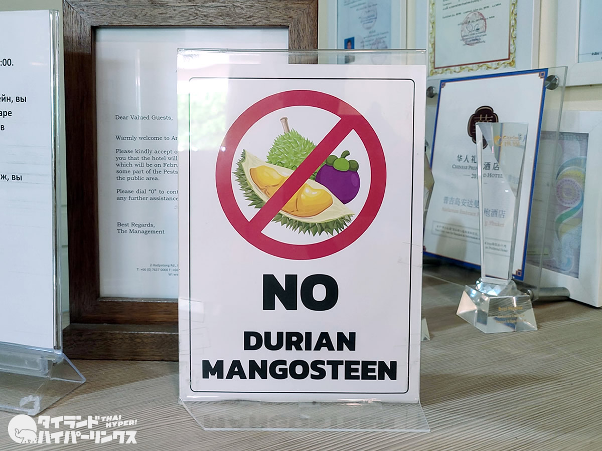 プーケット・パトンビーチの4つ星ホテル「アンダマン エンブレイス パトン」で見かけたのは、「ドリアンとマンゴスチン持ち込み禁止」の表示でした。ドリアンは納得ですが、マンゴスチンはなぜ持ち込み禁止?