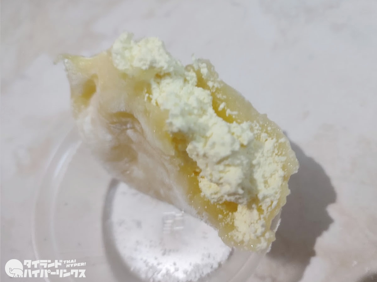 とっても柔らかいお餅の中に入っているのは、ドリアンの果肉でなくドリアン風味のクリーム。とっても柔らかいお餅なので、のびのびに伸びるので、半分に割るのは一苦労(笑)。見た目が悪くなってしまいましたが、味はバッチリです。風味はドリアンそのものので、ドリアン好きにはたまらなく、ドリアンが苦手な人も美味しく食べられることでしょう。