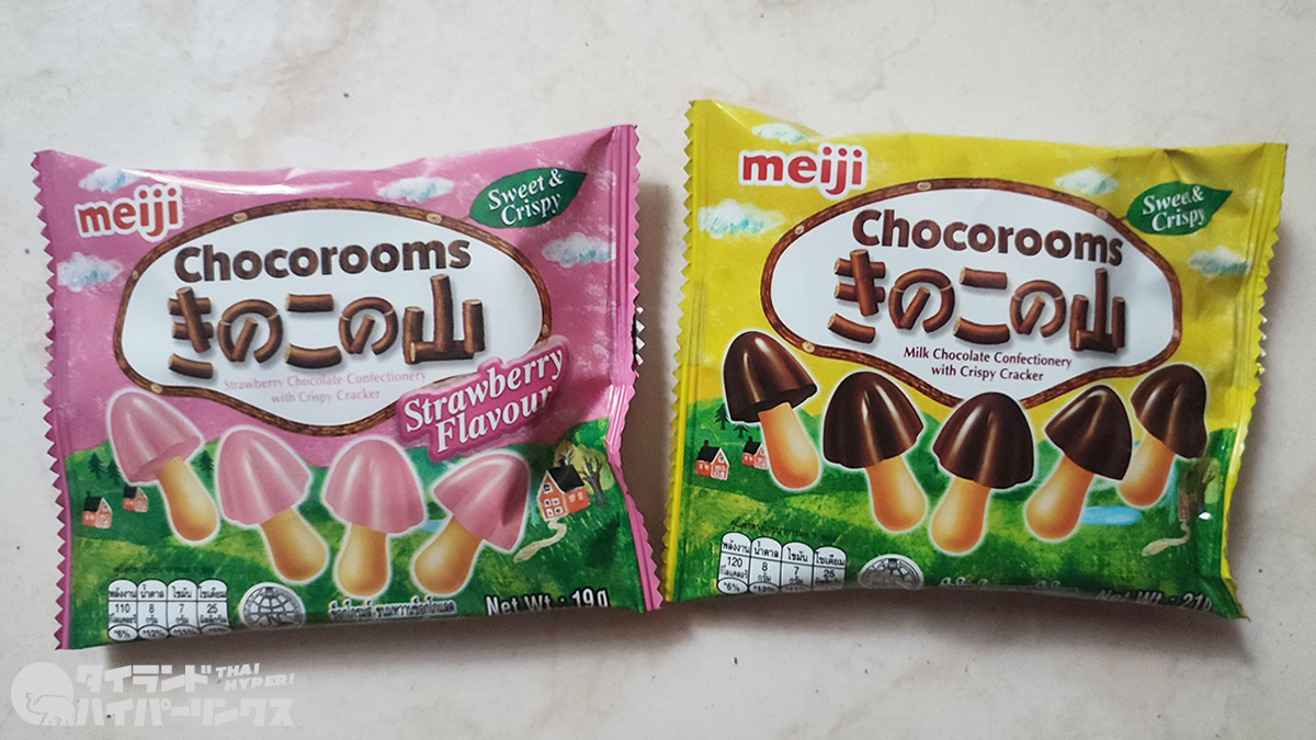 そんな「きのこの山」はタイでも販売されていて、この日はイチゴ味とともにコンビニで発見。価格は1つ(21グラム入り)で25バーツでした。