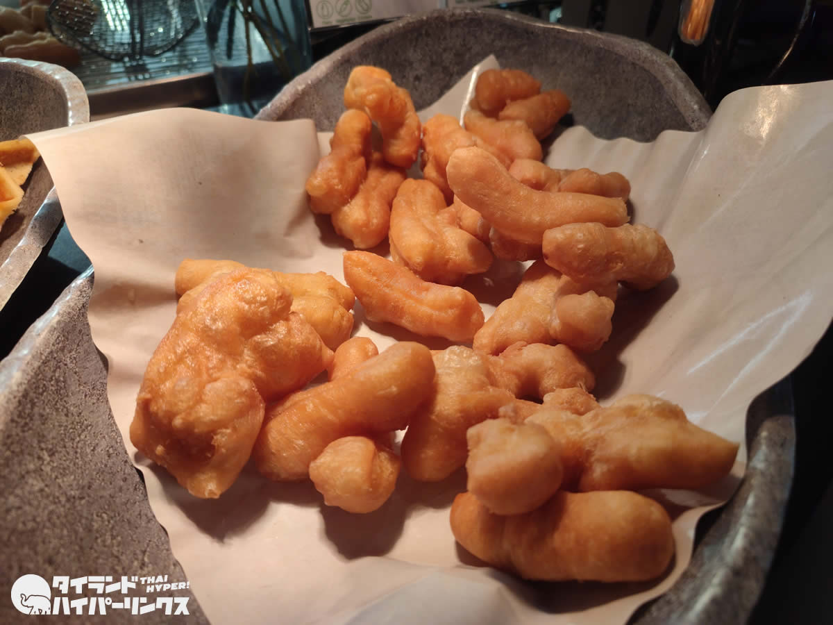 タイの朝食の定番パートンコーも、熱々の揚げたてがいただけます。パートンコーは、「世界で最も評価の高いストリート フードスイーツ10選」にも選出された揚げパンで、練乳やクリームをつけて、豆乳と一緒に食べるのがタイスタイルですね。
