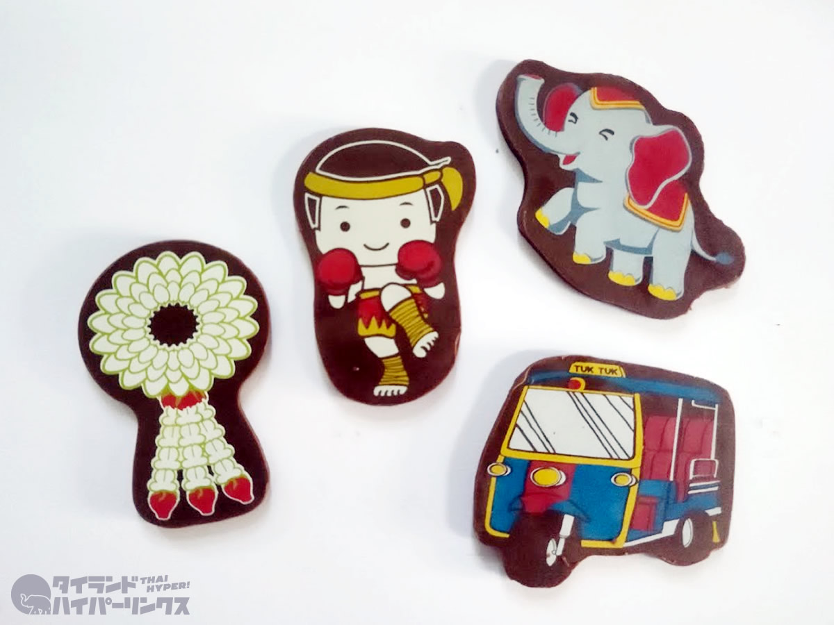 ただただカワイイ「I ❤ THAILAND」チョコレートの価格は35バーツ。タイ名物3輪タクシーのトゥクトゥクのパッケージに、トゥクトゥク、ムエタイボクサー、ゾウさん、そしてプアンマーライと呼ばれる花飾りを象ったチョコレートがセットになっています。