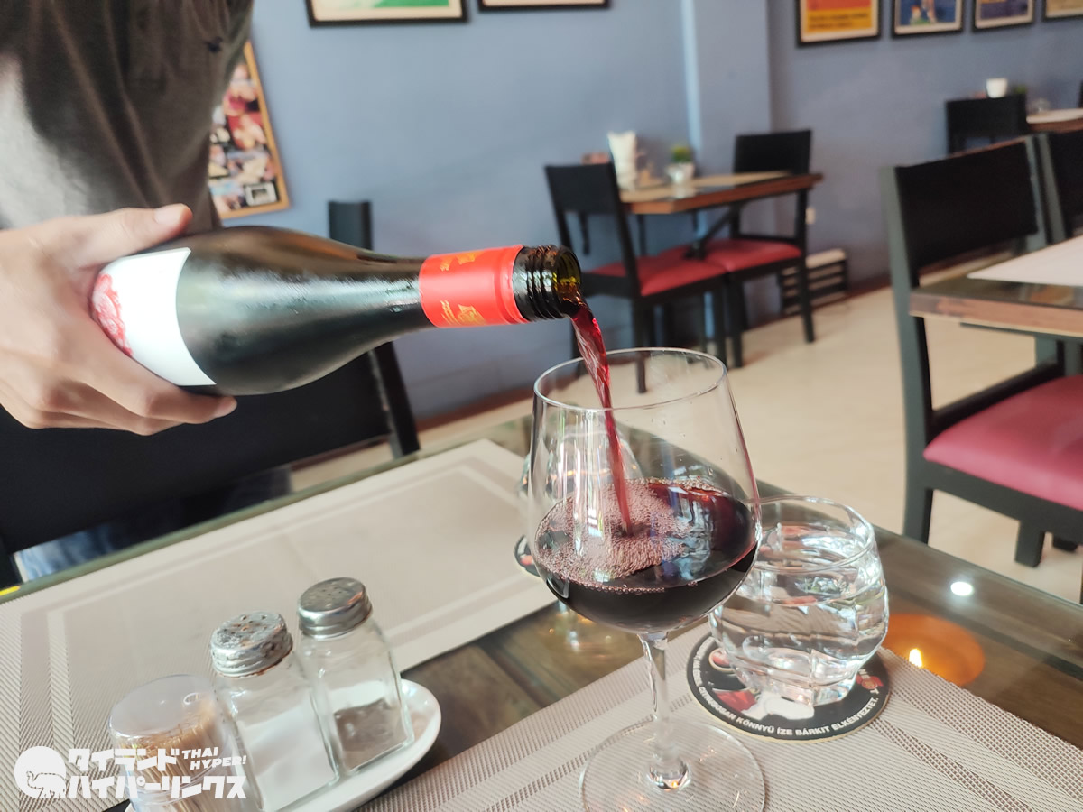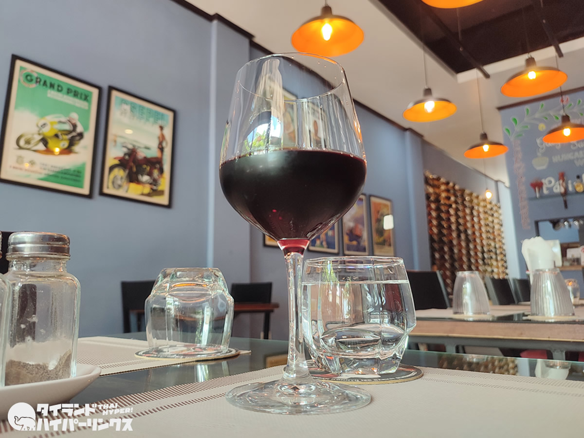 何も言わないでいたら赤ワインが出てきたので、それをいただきました。スッキリ飲みやすく、美味しいワインですね。量もたっぷりです。ワインのブランドは不明です。