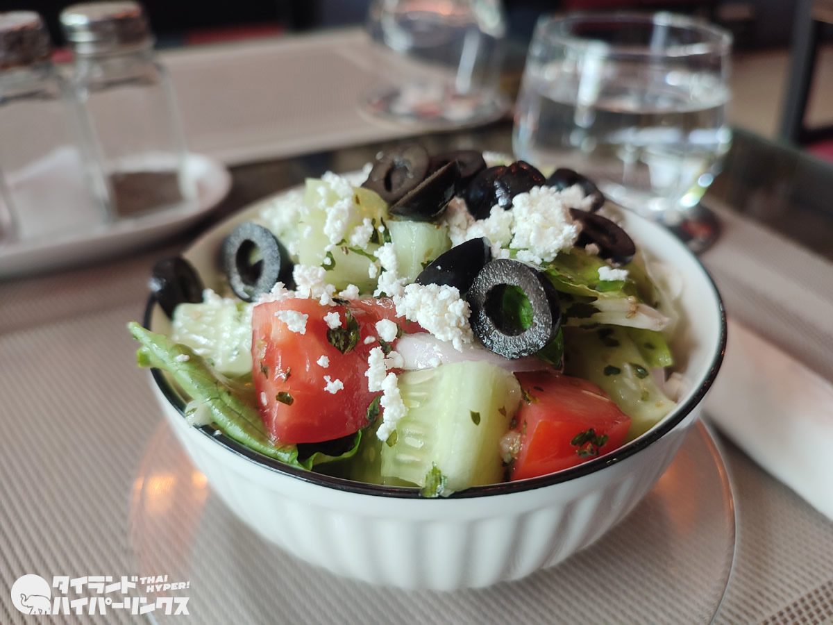 キュウリにレタス、トマトにオリーブにチーズがかかったグリークサラダで、気分はヨーロッパ。