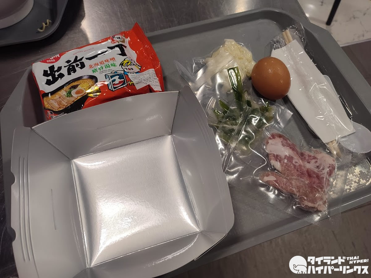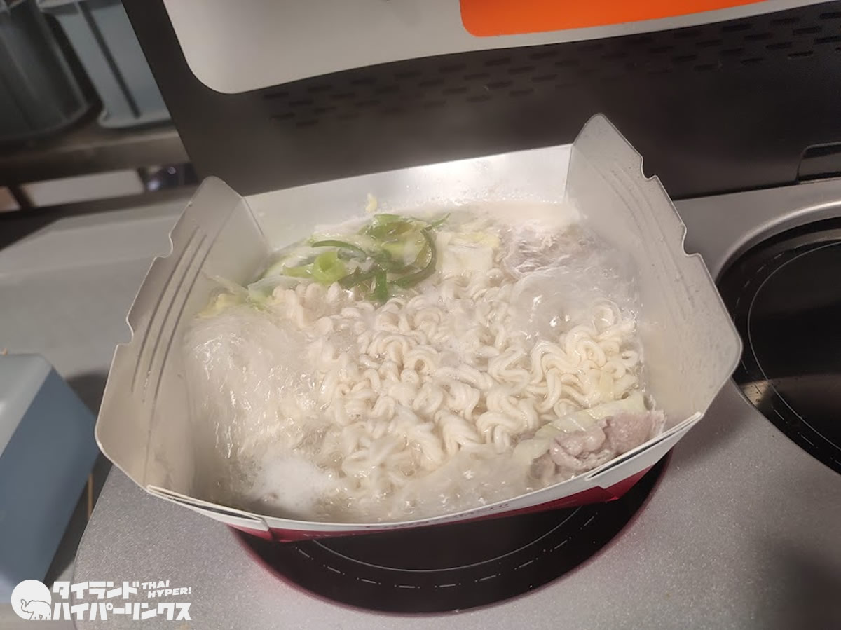 ちなみにタイで売られている「出前一丁」の袋麺は香港製。赤いパッケージのごま油入り醤油ラーメンも好きですが、この日はオレンジ色のパッケージの味噌ラーメンを選びました。価格は一つ35バーツです。