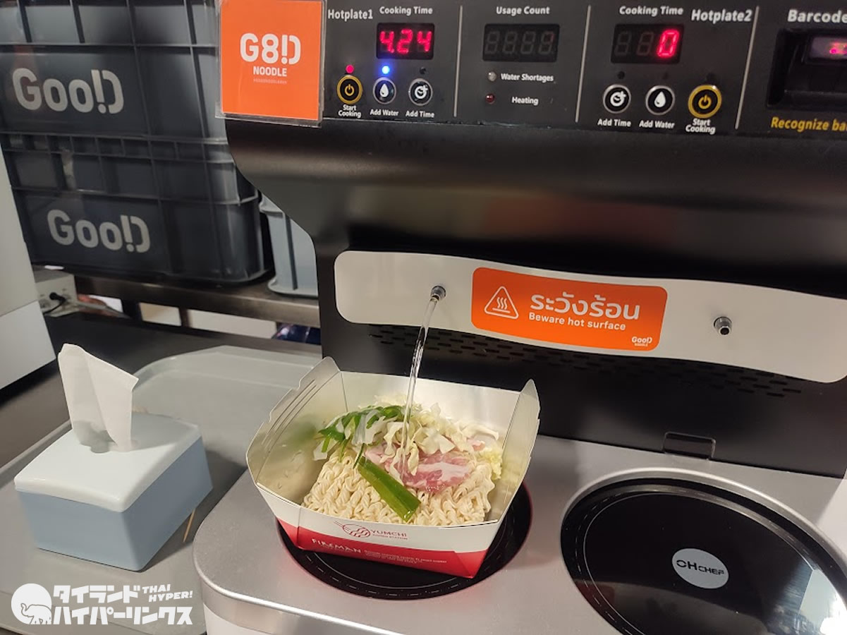 紙製の鍋に麺と具材を入れて(卵を入れてはいけないそうです。卵は温泉卵風のゆで卵)、調理マシンの前へ。紙の鍋にあるバーコードを読み込ませて、お湯を入れ、グツグツ煮込みます。