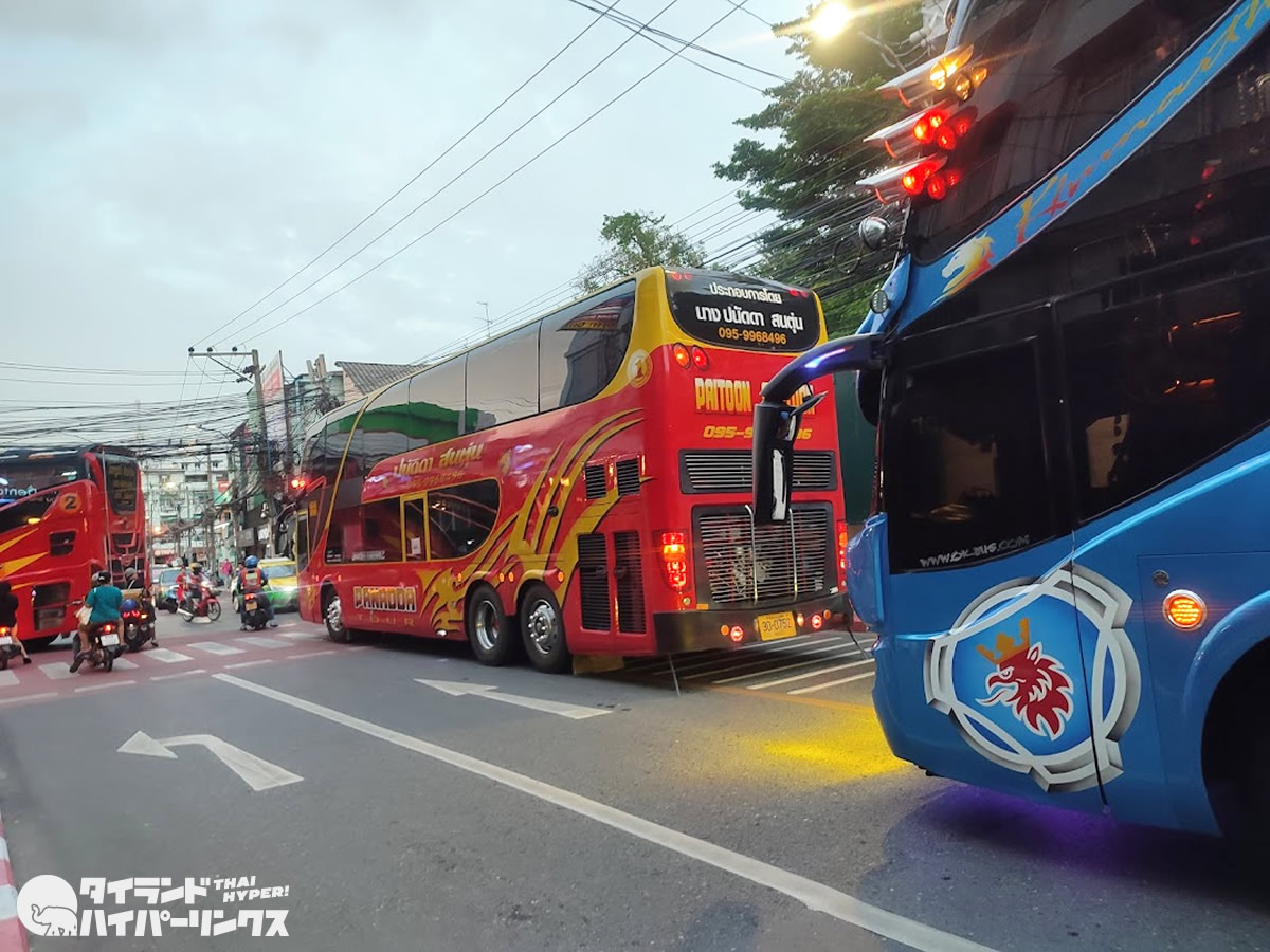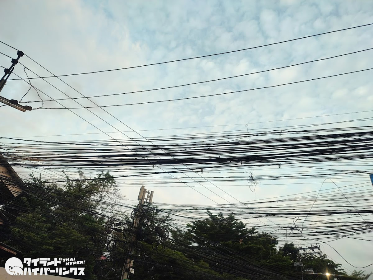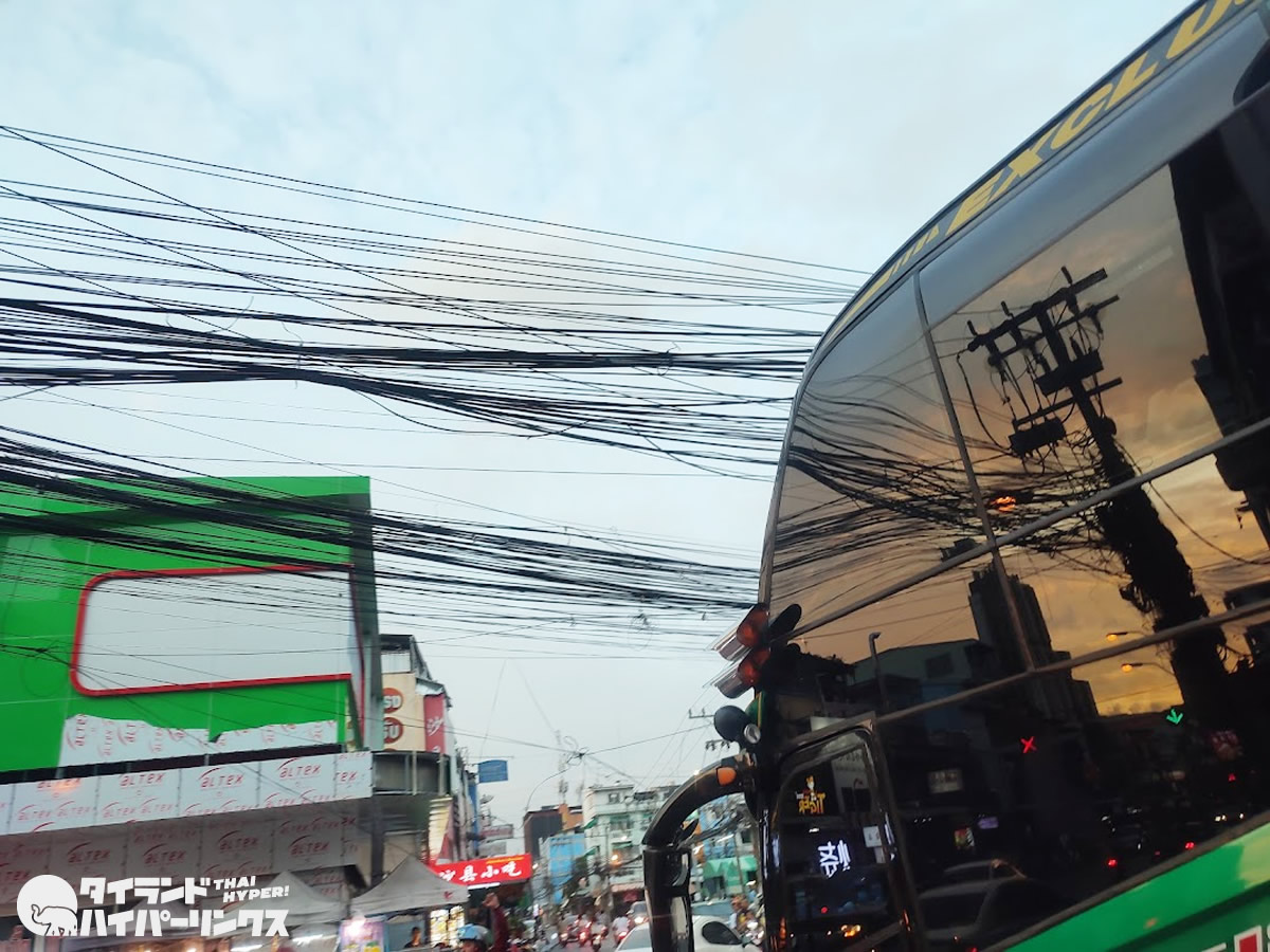 タイでは度々見かける、垂れ下がった電気や通信のケーブル。走行しているバイクにケーブルに絡まったり、ケーブルに触れて感電したりすることもあり非常に危険です。そんな中、バンコクのホワイクワン地区にある丁字路でもケーブルが垂れ下がり、そこに大型観光バスが連続して迫っていました。