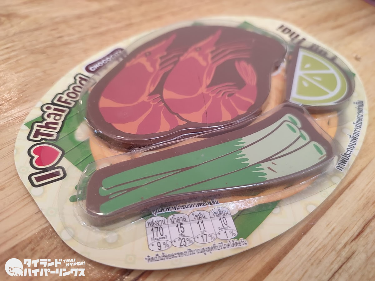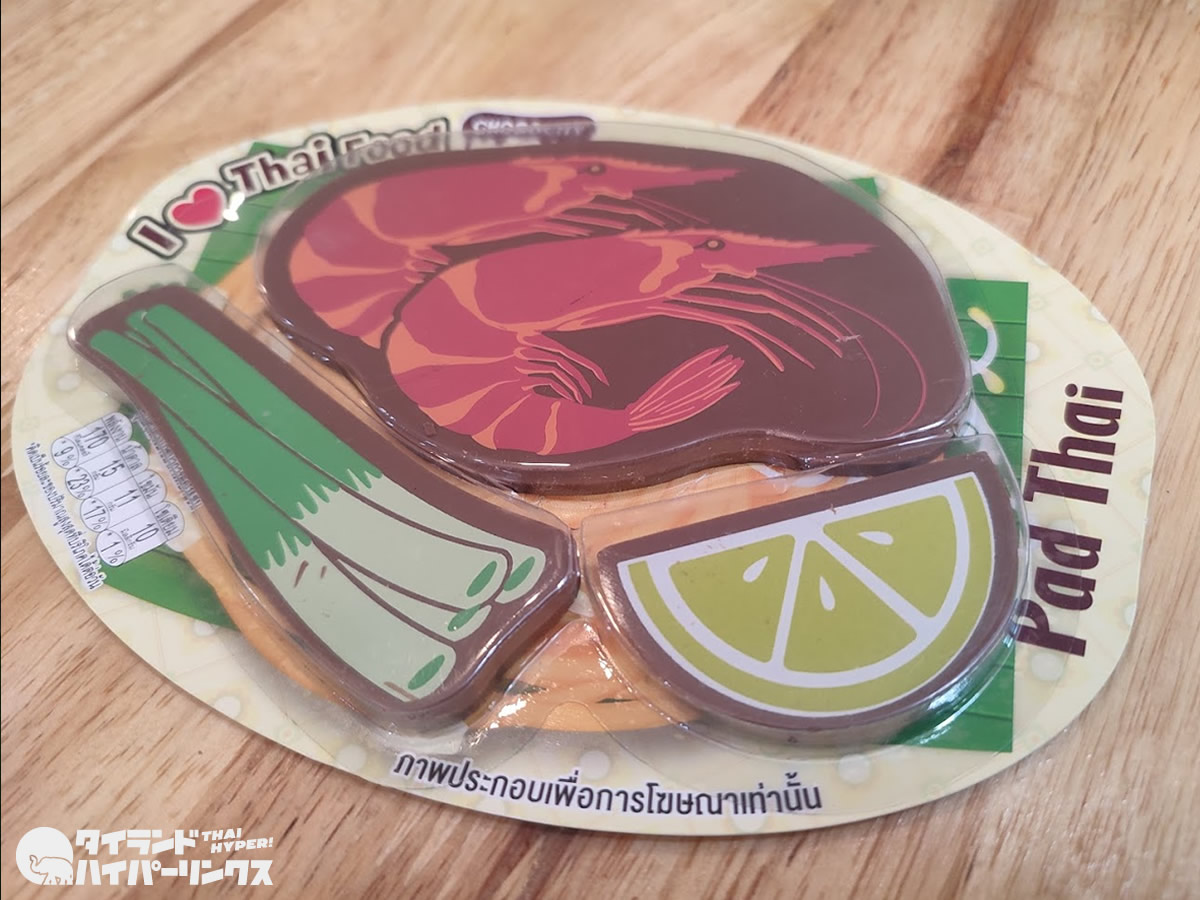 そんなパッタイのチョコレートが登場。とは言ってもチョコレート味のパッタイというわけではなく、パッタイに模したチョコレート。ちなみにチョコレートは海老、ネギ、マナオで、麺の部分はイラストです。