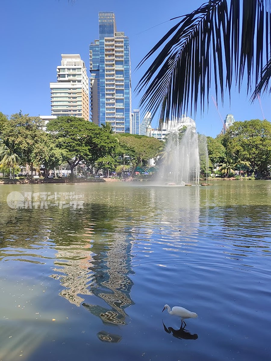 タイ国政府観光庁の言う通り、ルンピニ公園はバードウォッチングが楽しめる場所としても有名です。この日に姿を見せた白くて美しい鳥はサギでしょうか?サギとミズオオトカゲがニアミスすることもありましたが、お互い全く気にも留めないようでした。