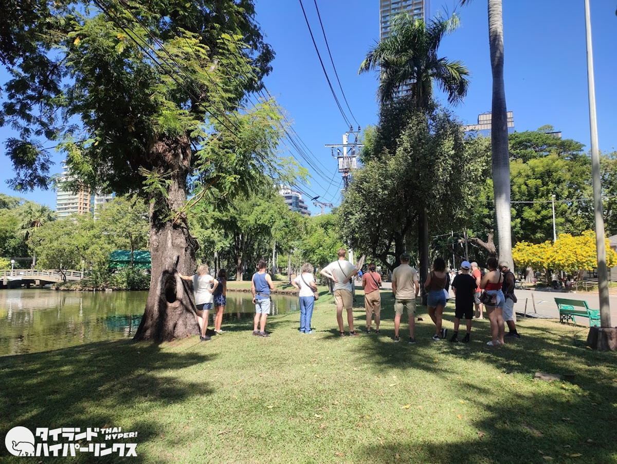 ルンピニ公園の池の畔を歩いていると、外国人旅行者らしき人だかりを発見。その中心にいたのはミズオオトカゲたちでした。現地ツアーか何かで、ミズオオトカゲを観察するコースがあるのかもしれませんね。