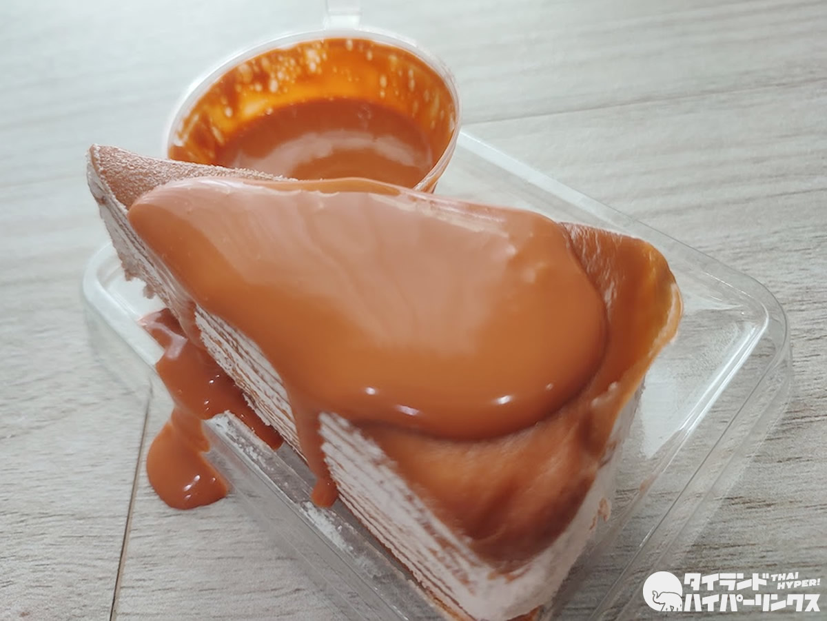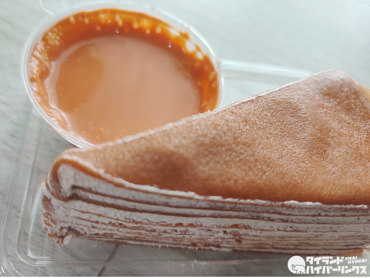 そんなタイ紅茶のスイーツが、セブンイレブンに登場。この日に購入したのは「ミルクティークレープケーキ(Mil Tea Crape Cake)」(39バーツ、約160円)っです。