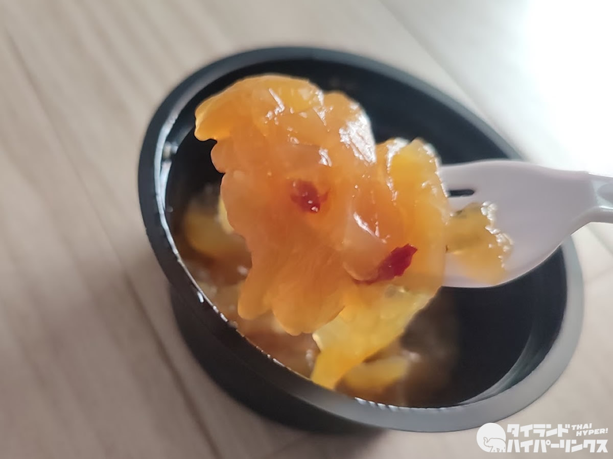 「ごま油 中華くらげ(あるいは 中華くらげ ごま油)」のタイ語名は「แมงกะพรุน นำมันงา( メーンガプルン ナムマンガー)」。思った通りの味で、こりこり食感がたまらず、これはオツマミにピッタリ。価格も一つ25バーツ(約100円)と、お求めやすい価格です。