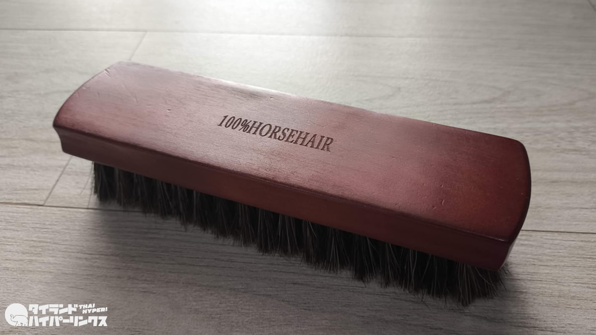 届いた新品の財布に、同じくネットで購入したデリケートクリームとミンクオイルを塗って磨くと、革がプルンとした感じなります。馬毛ブラシも革製品のお手入れには欠かせないのだとか。