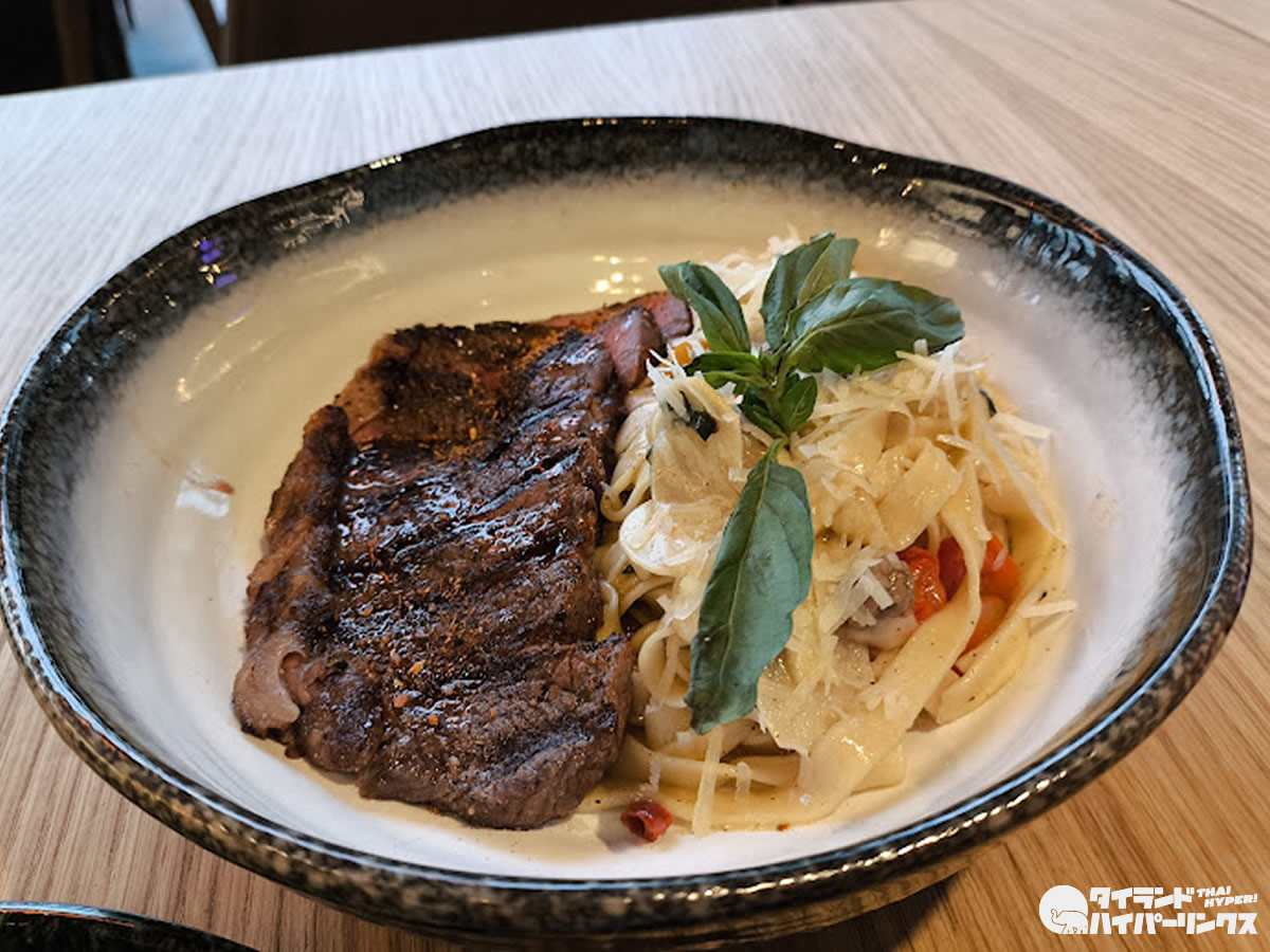 「ローラーコースター」と名付けられたステーキとパスタ(429バーツ)。