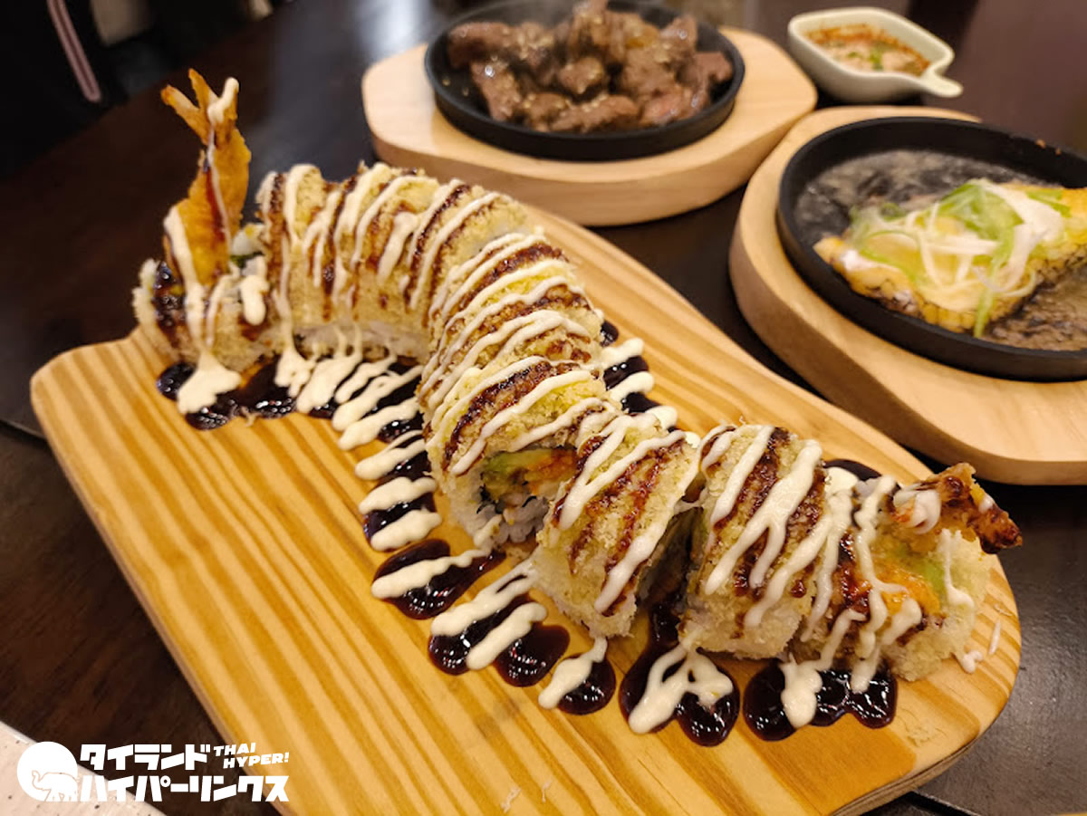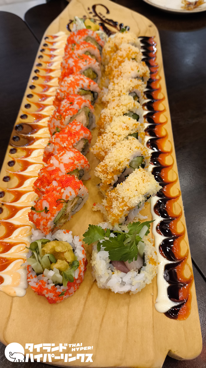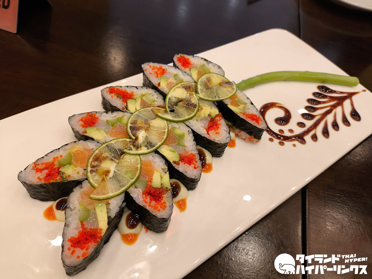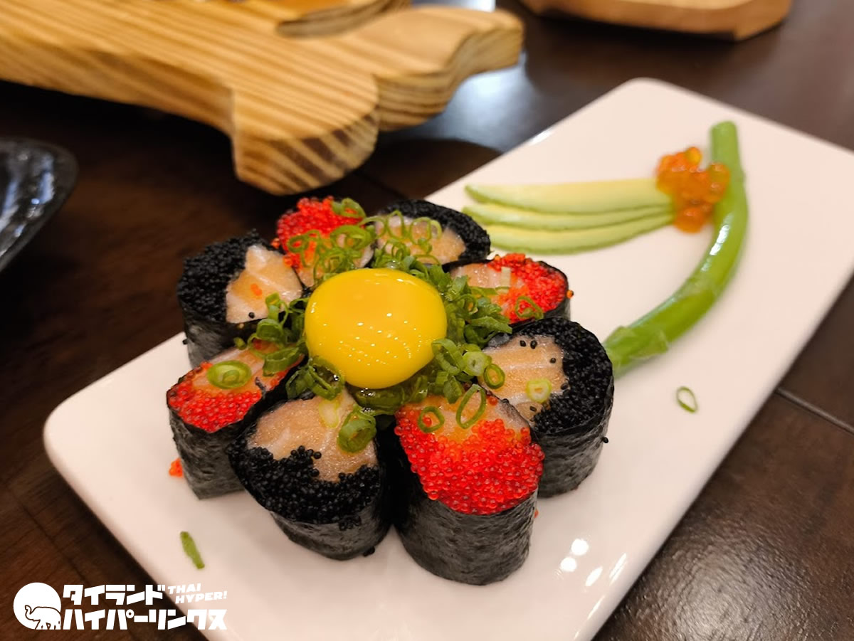 「Maji Maji」は、日本料理に東洋と西洋、さらにはタイ東北地方(イサーン)の魅力を融合させた独自の日本料理レストラン。見た目に全振りしたかのような巻き寿司と、ときにイサーンの風味も加わったフュージョンの日本料理をたっぷり味わいました。