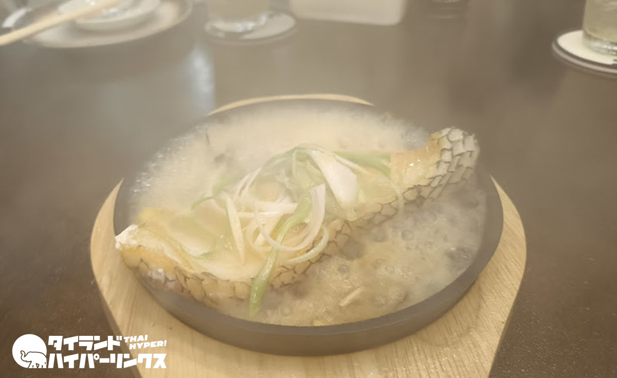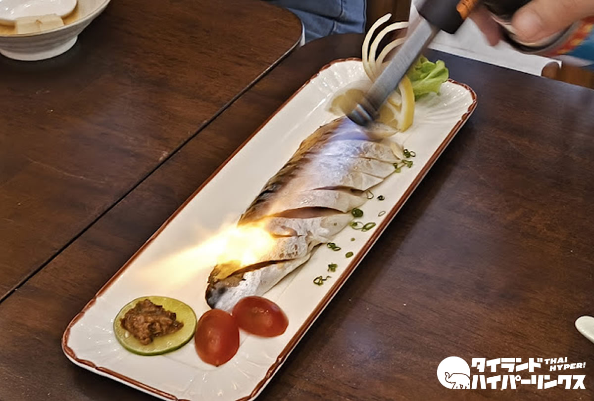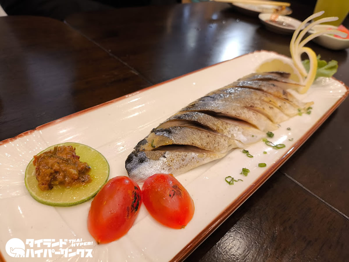 他にもテーブルで炙ってくれるしめ鯖や、イカ焼き、ステーキ、和えたサーモンなど居酒屋メニューが充実。味噌で味を整えたタイのスープは驚きでした!