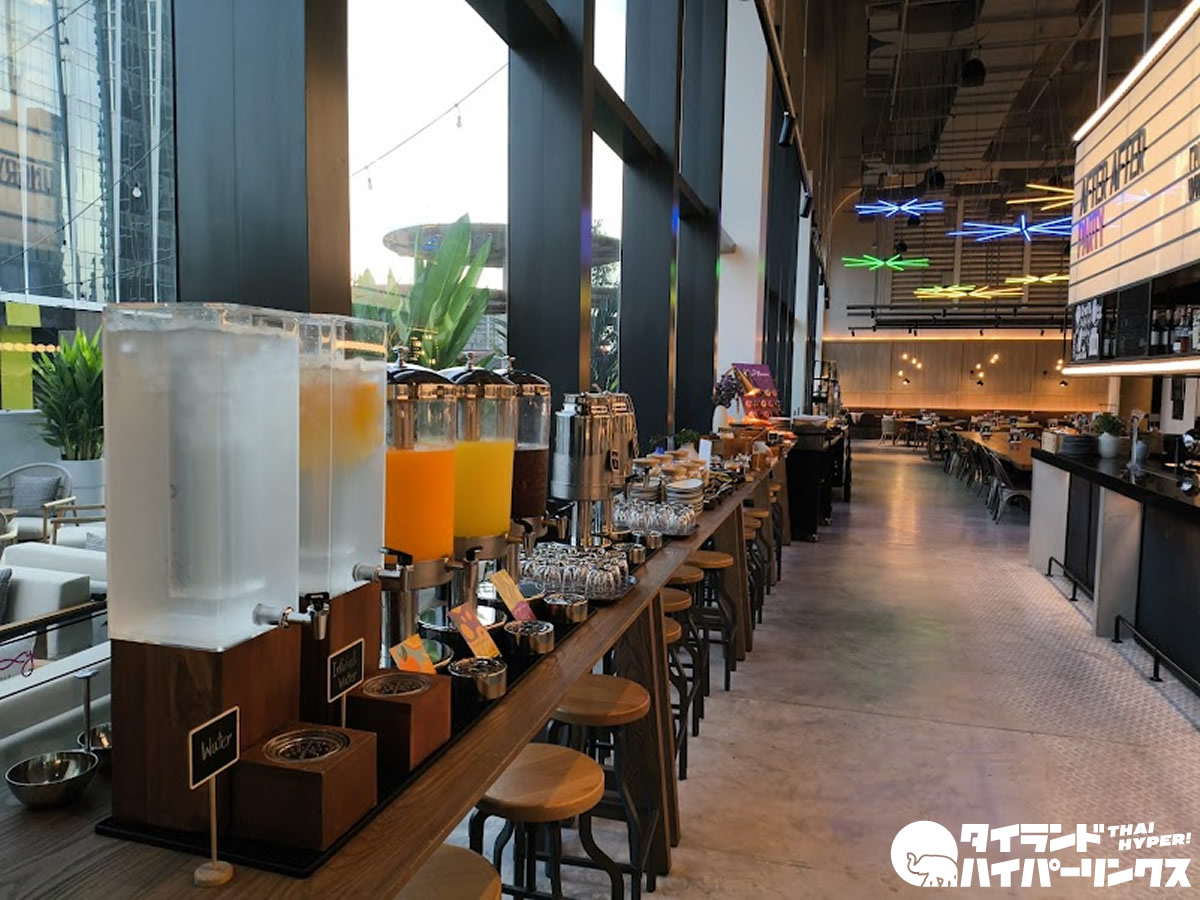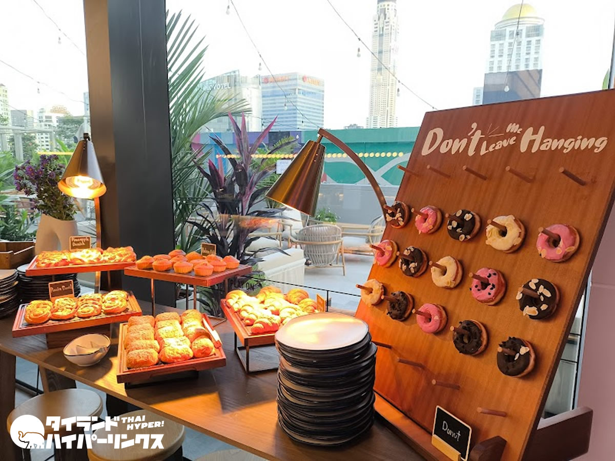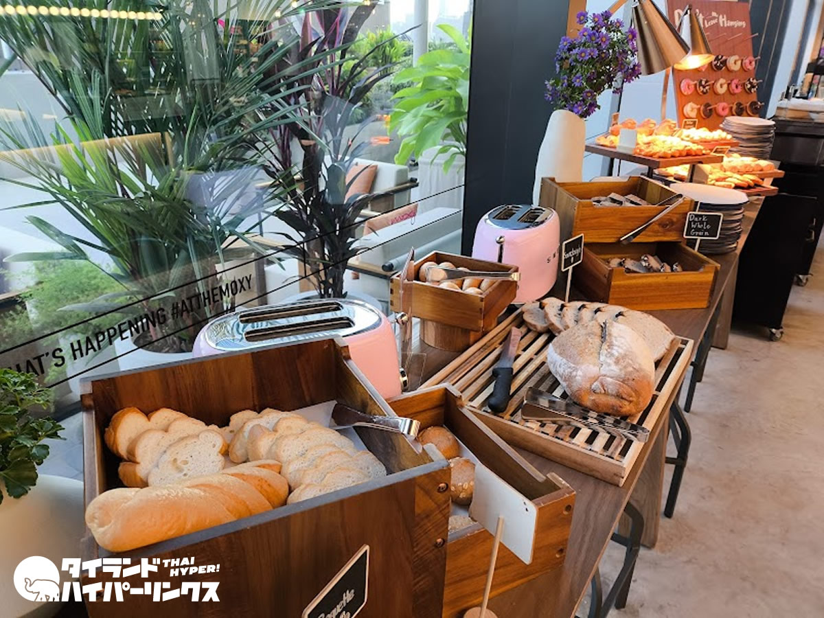 会場全体に漂うカジュアルでポップなエネルギーが、モクシーならではの魅力を引き立てています。窓際の席では、朝の光を浴びながら一杯のコーヒーを味わうことができ、目覚めたばかりのバンコクを感じるひとときが楽しめます。