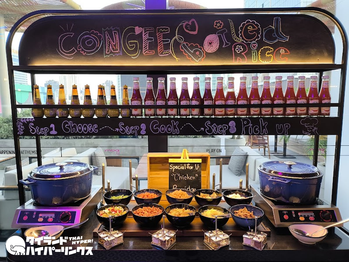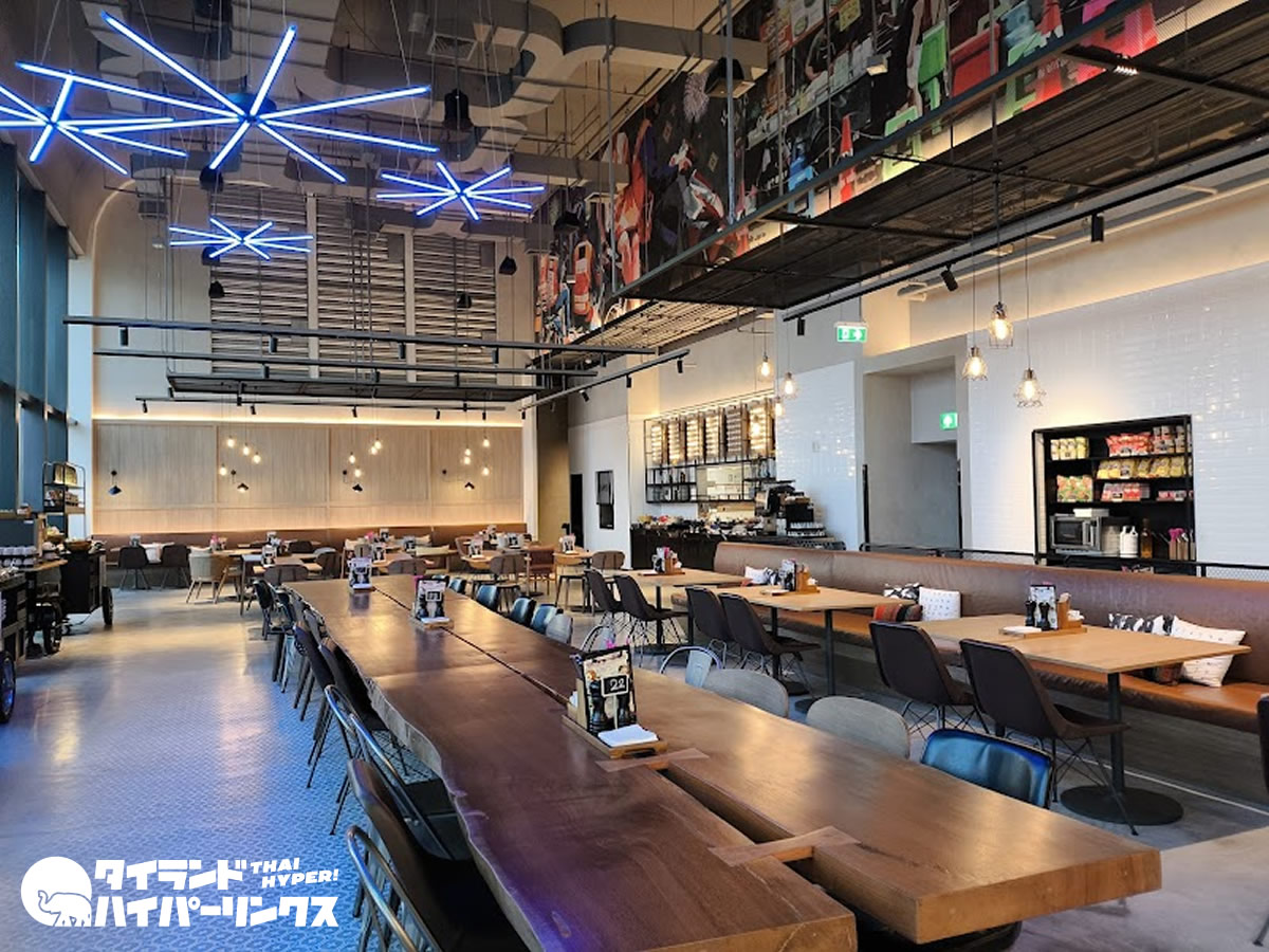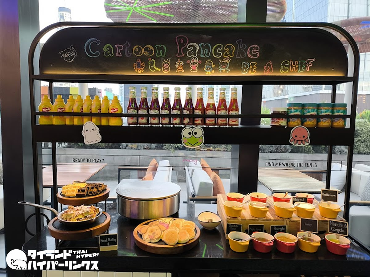 会場全体に漂うカジュアルでポップなエネルギーが、モクシーならではの魅力を引き立てています。窓際の席では、朝の光を浴びながら一杯のコーヒーを味わうことができ、目覚めたばかりのバンコクを感じるひとときが楽しめます。