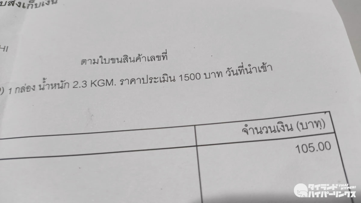 配達員さんは何も説明せず「105バーツの支払いがあります」と伝えてきましたが、もちろん関税なんだろうと思いつつ現金で支払い、小包を受け取りました。それと一緒に渡された書類は Postal Customs Service Divisionからの通知書で、内容品の評価額を1500バーツ(約6600円)とした上で、支払額が105バーツでした。