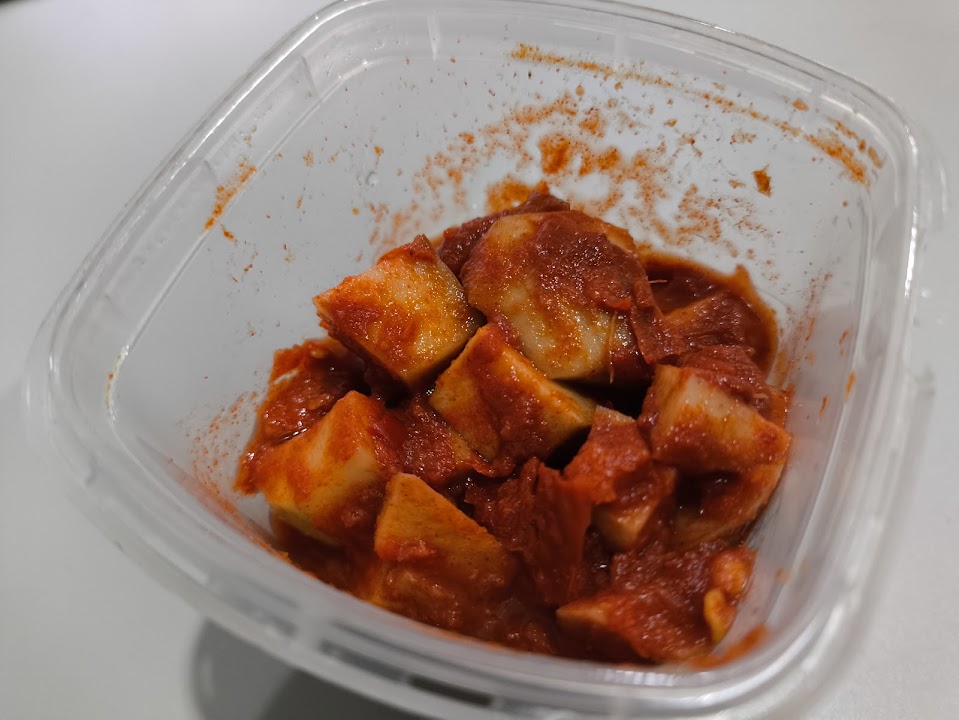 ミニフォーク付きなので、買ってすぐに食べられるマンゴーキムチ。早速一口食べてみると、酸っぱいこと酸っぱいこと(笑)。若いマンゴーの酸味なのか、キムチが酸っぱくなったのかわかりませんが、とにかく酸っぱい。きっと好みが大きくわかれるところでしょう。気になる方は、TopsかTops dailyへ。