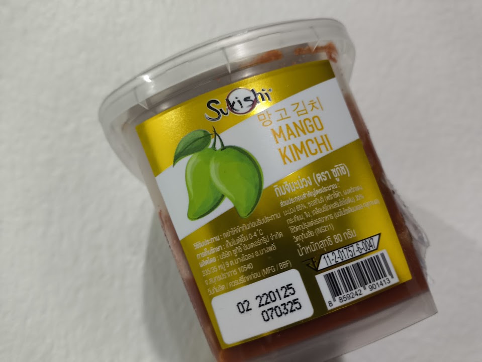 ファミリーマートが撤退してTopsとなりましたが、そこでマンゴーのキムチを発見。それはレストラン「Sukishi」ブランドの商品でした。89グラムで39バーツとのことで早速買ってみました。