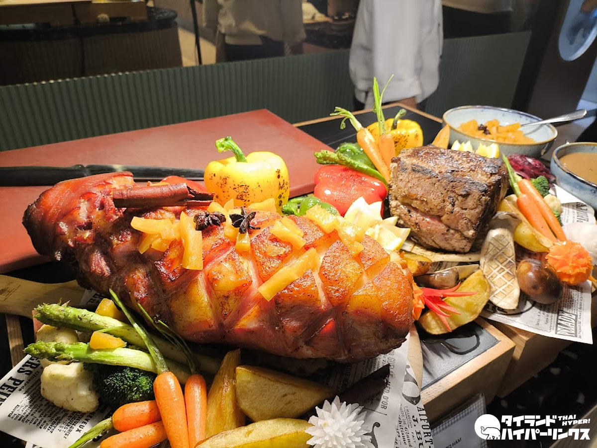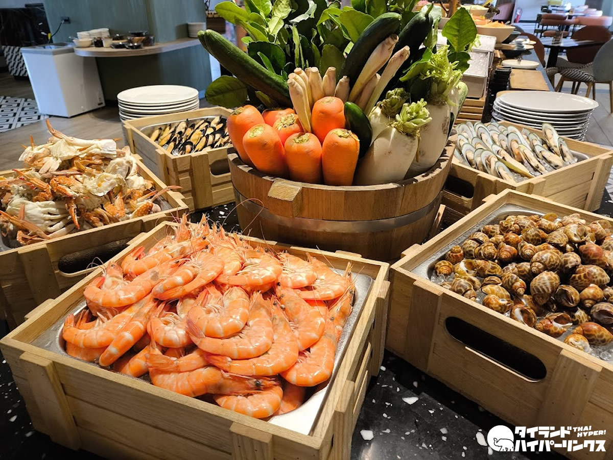 エビやカニやムール貝など新鮮なシーフードや刺身が食べ放題のほか、グリルサーモンやソーセージ、ピザ、デザートまで楽しめる贅沢な内容です。この日食べたプラーガポンの醤油には絶品でした。