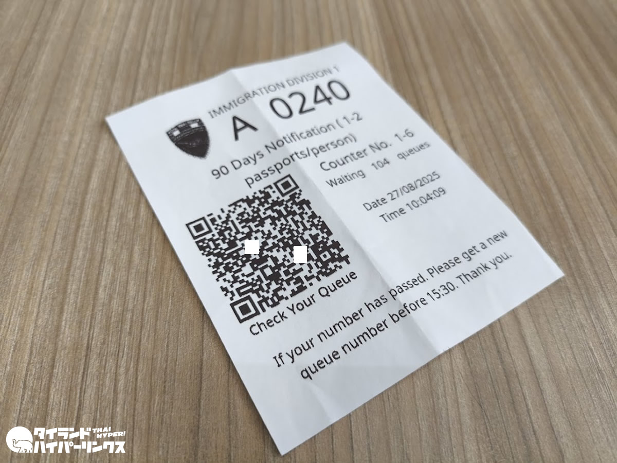 この日は朝10時頃に窓口へ。記入済みの「90日レポート」申請書類とパスポートを受付にだして、整理券を貰いました。240番で、104人待ち。スマホでQRコードを読み込めば、どこにいても残りの待ち人数がわかります。