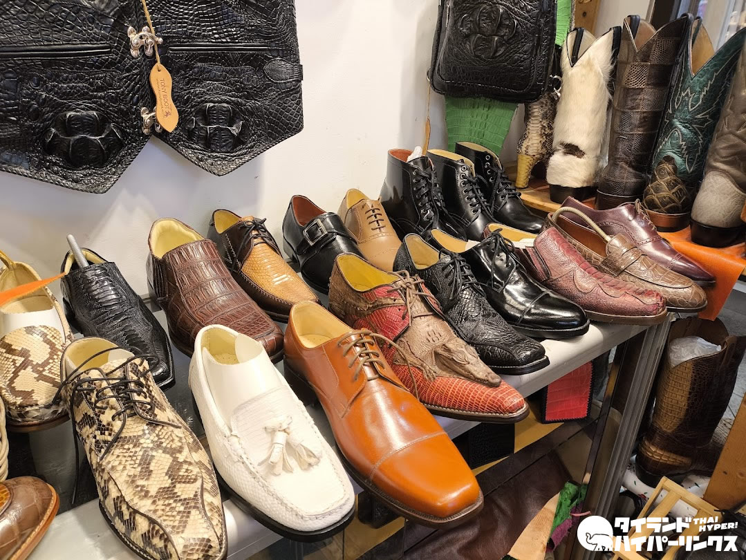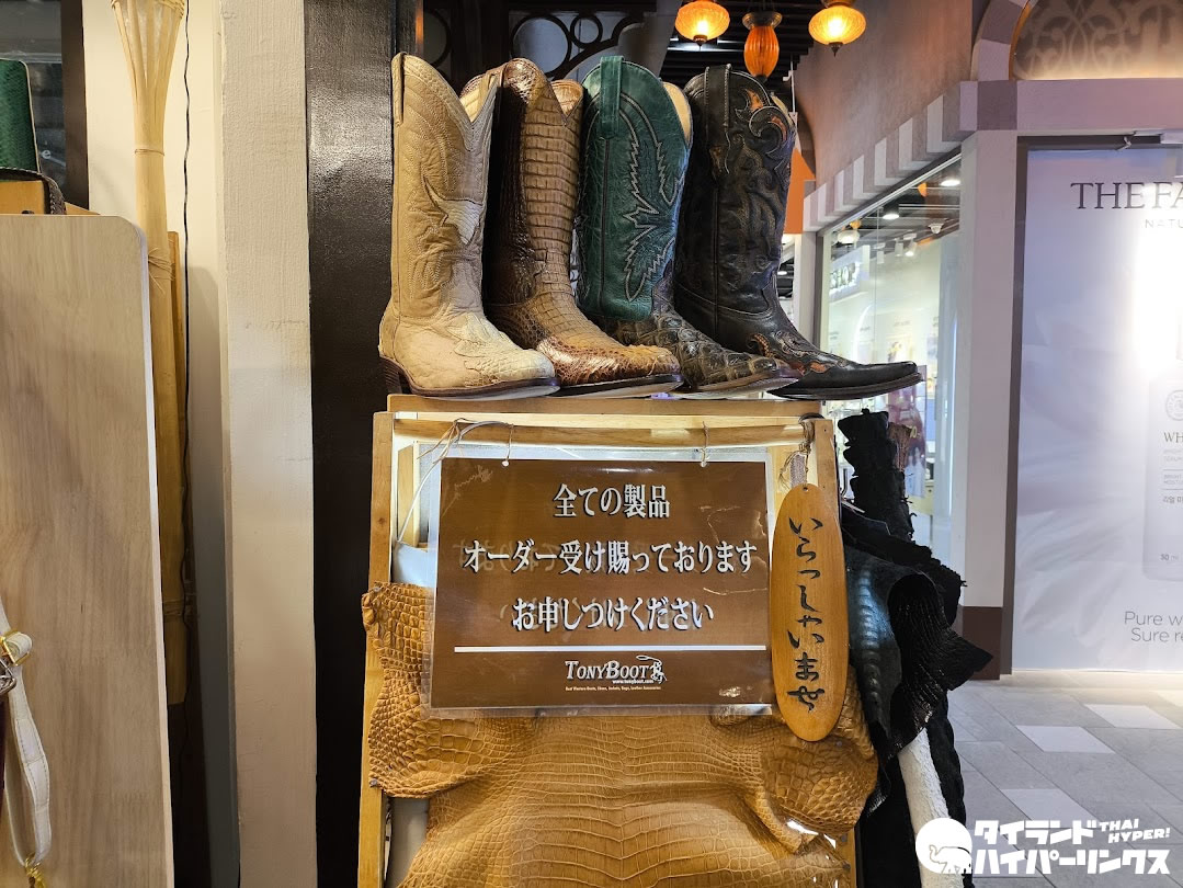 「Tony Boot」は、ブーツや短靴を中心に、ベルトやバッグ、ジャケットなどのレザーアイテムを手作業で仕立てる店で、牛革やワニ革をはじめとしたエキゾチックレザーを使ったオーダーメイドにも対応しています。以前はスクンビット通り沿いのアソークとナナの間に店舗を構えていて老舗の有名店で、現在はターミナル21内に店舗を移しています。