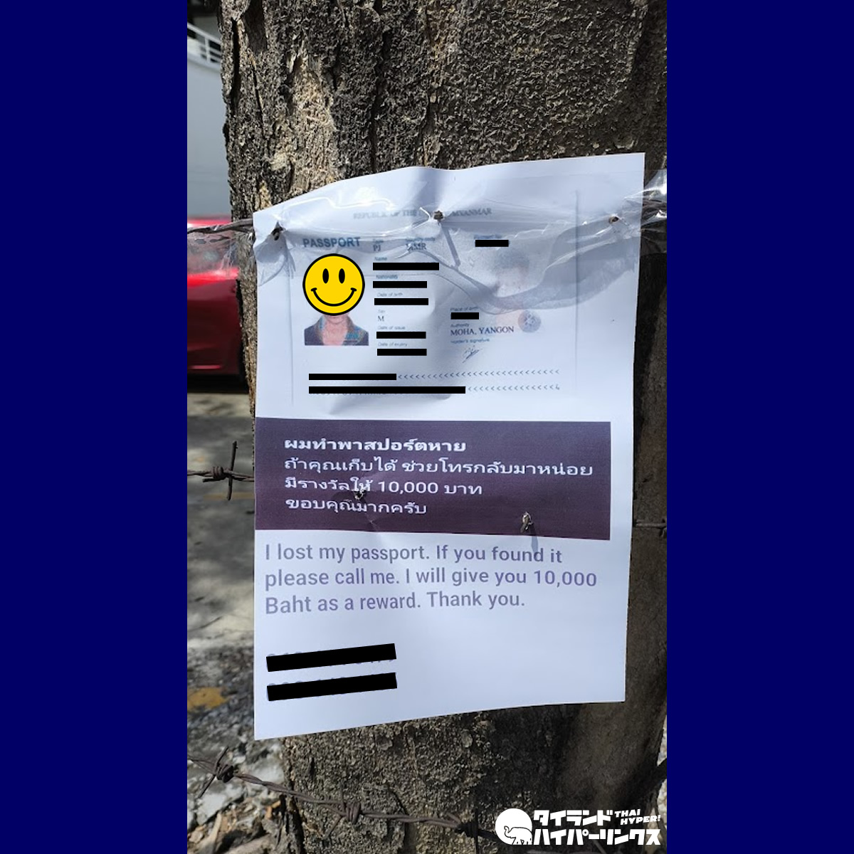 張り紙のパスポートのコピーを見ると、落とし主はミャンマー出身で、誕生日を迎えたばかりの21歳。つまり二十歳の紛失です。おそらく謝礼の1万バーツというのは、月収に近い額ではないでしょうか。