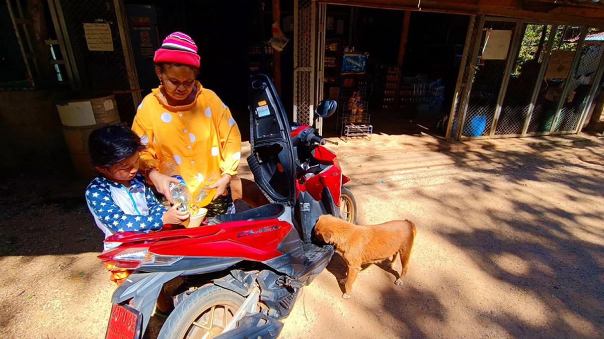 マーク島にはガソリンスタンドはなく、ガソリンは売店でペットボトルに入れて売られています。「満タンで!」と言うと「よろこんで!」と言わんばかりにガソリン二刀流で入れてくれました。そこに群がる犬。はい、島でよくある風景ですね。