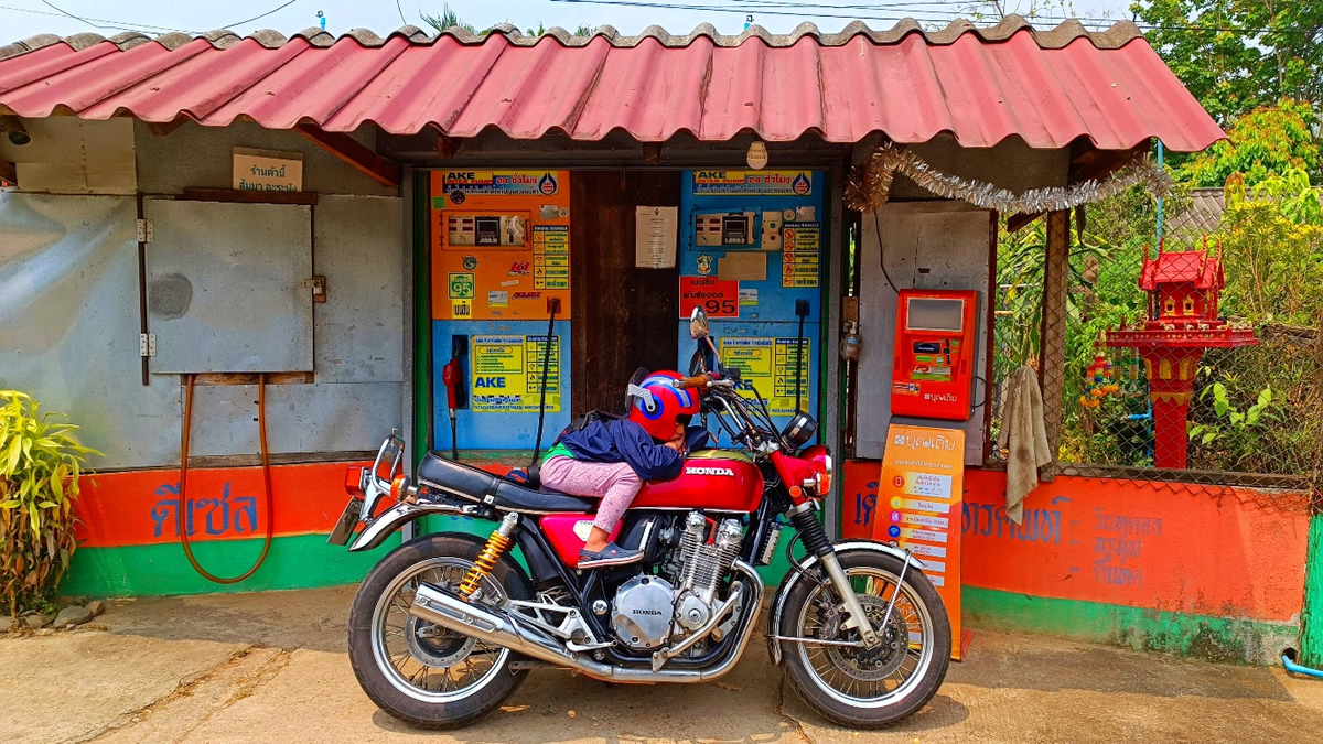 ところで私のCB(CB1100EX, 2014年式)は燃料タンクも変えており、だいたい350~400kmほど走ります。なのでこれまでタイを30県回っていて「ガソリンがない!」という状況はあまりなかったんですが、今回はおそらく初めてGoogleマップでガソスタ検索して且つ、ガソスタを目的地よりも優先して駆け込みました。先のローカルのガソリンはできれば入れたくなかったので。