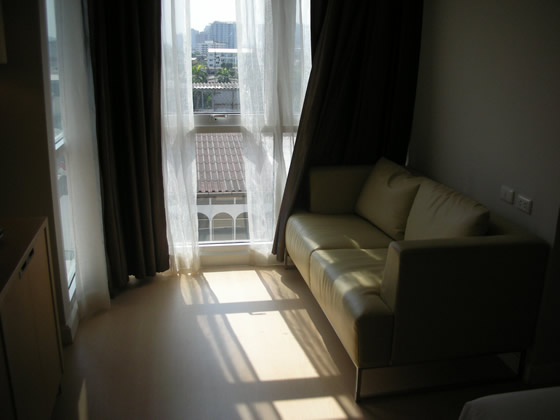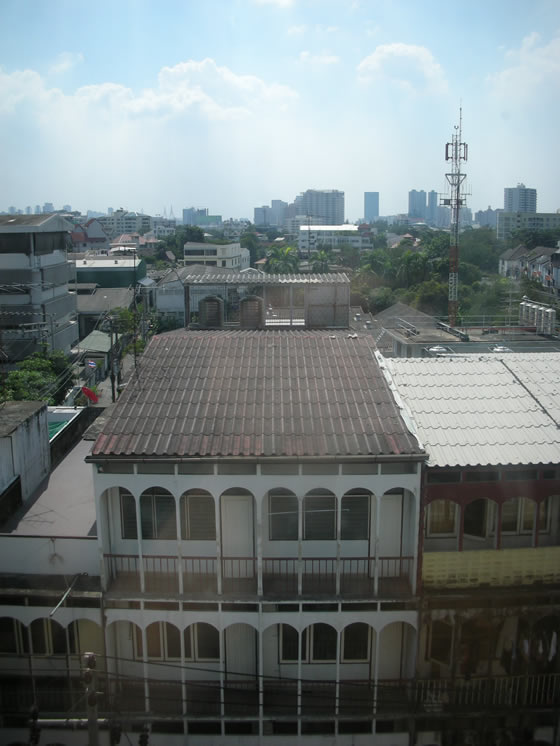 窓ぎわには居心地のいいソファーがあって…この窓から、いかにもバンコクを求める人には最高の下町の景色が目に飛び込んできます。