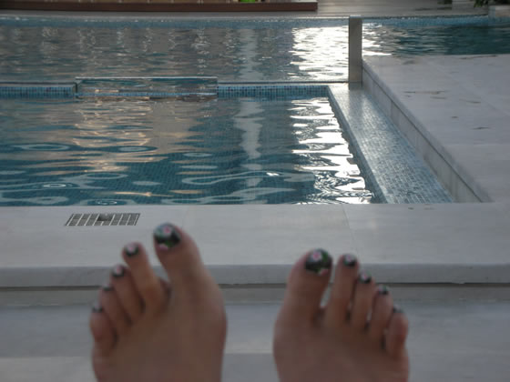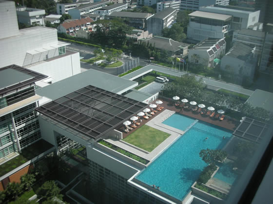 タイのホテルの醍醐味、それはプール。リバーサイドだとチャオプラヤーが眺められたりするけど、町の真ん中のホテルって、そうはいかない。高層ビルの、高層階にあれば素晴らしい街並みが眺められるけど、うーん・・・なかなかありません。雰囲気とか、ある程度の開放感とか、リゾート色はほしいなあ。
