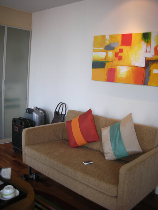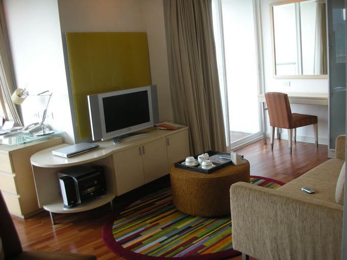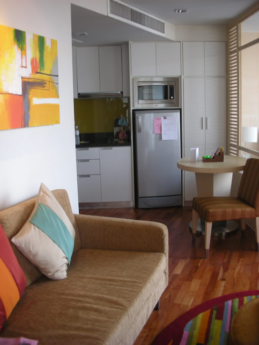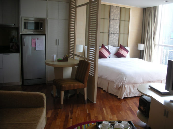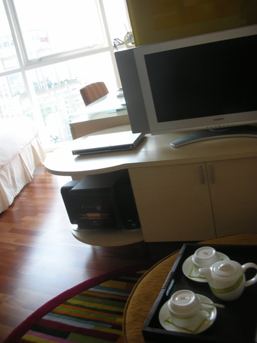丁度ビルのコーナー部分になっているので、窓際のベッドルームとリビングエリアが分かれた作りになっているので、スタジオでもワンベッドルームスイートのような配置。これならスタジオでも十分!一人でさっと食事できそうなテーブルもあって、そこにはお茶、コーヒーのほかにちょっとしたお菓子が無料のサービス。まあ!ありがたい。
