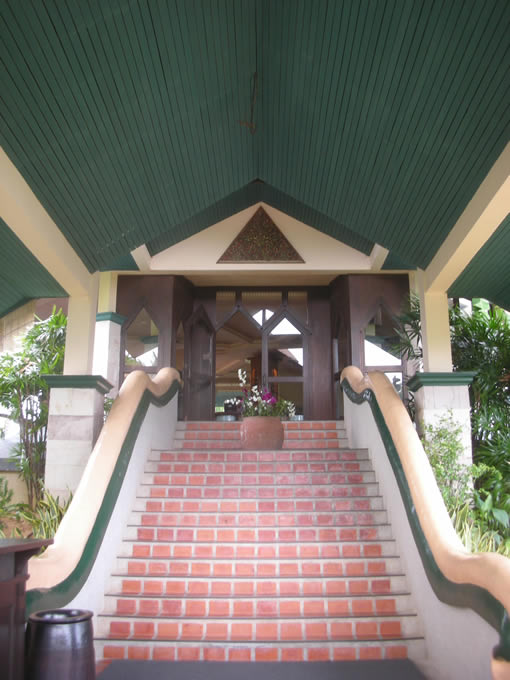 車から降りると、そこは赤茶色(マンゴスチン色?)の屋根のコテージが点在する、別世界でしたー。階段も、なんだか童話の中の世界みたいじゃないですかー?さすがにこの階段は荷物を持って上がれないのでポーターさんが一生懸命運んでくれます。