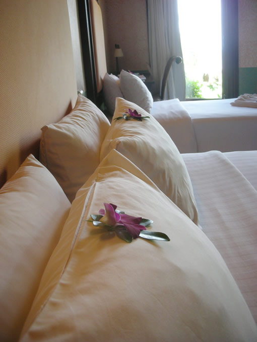枕の上にも蘭の花が一つずつ置いてあって、なんだか非現実的…だけど?あれ?この蘭の花、色々な所に置いてあります。たどってみますか・・・。