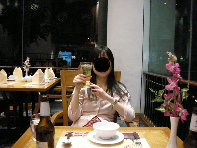 ま、リバーサイドなのに2000バーツのホテルに期待するのはかわいそうざんす。何瀬今回は2名利用だから1名たった3000円程度で泊まらせていただいてまして、とブツブツ言っておりましたら、ありました。1階に24時間やってるレストランが。しかも朝食レストランとは違う、ロビーとつながっているようなきれいなレストラン。