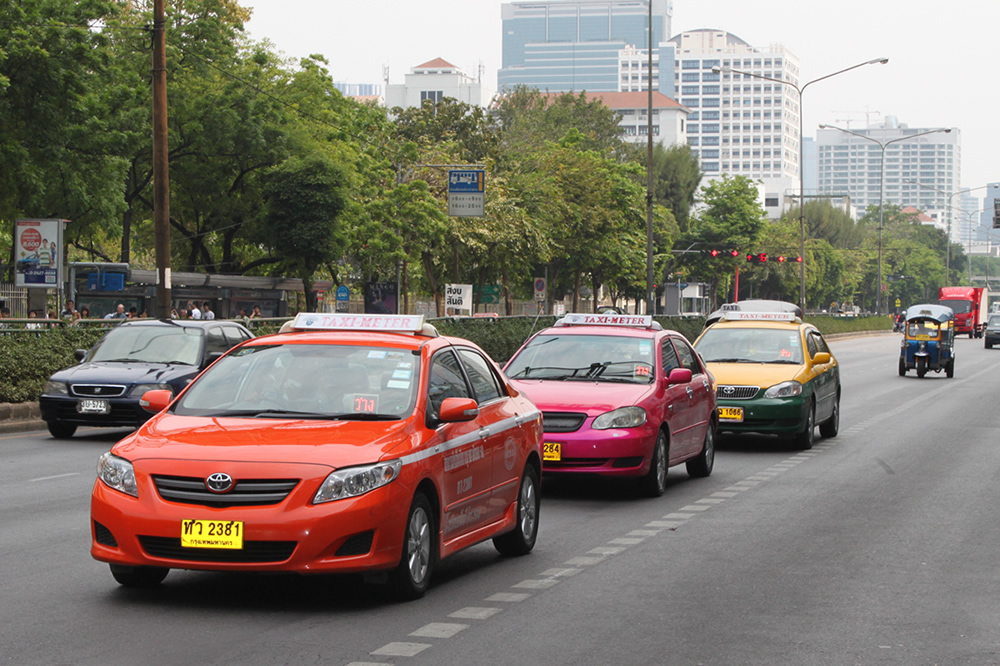 バンコクの道路の様子です。カラフルなタクシーが走っています。