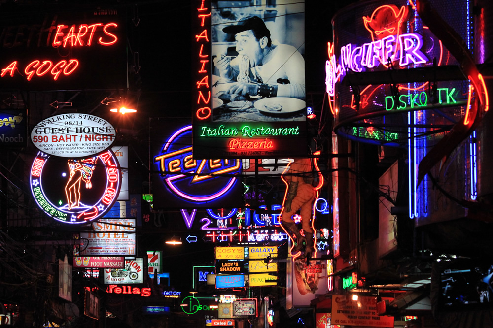 タイのリゾート地パタヤのウォーキングストリートの看板群です。