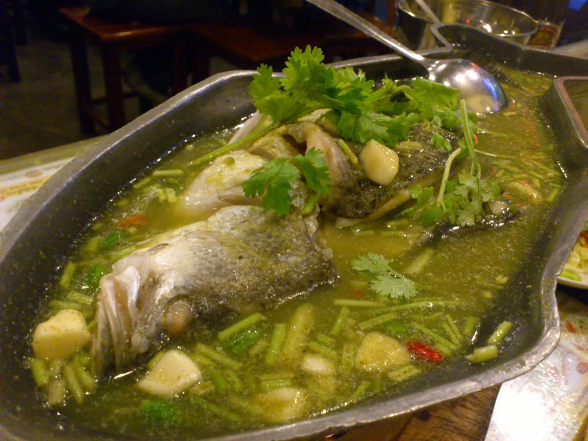 ンニクたっぷり、辛くて酸っぱいプラーガポン・ヌン・マナオ(ปลากะพงนึ่งมะนาว)。 鱸(スズキ)のライム煮です。魚の形をした鍋がかわいいです。