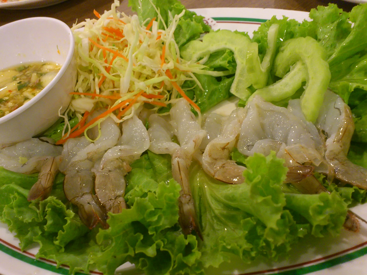 ビのお刺身クン・チェー・ナンプラー(กุ้งแช่น้ำปลา)。 苦瓜などの野菜と一緒に、にんにくと唐辛子とライムの効いたナンプラーで。