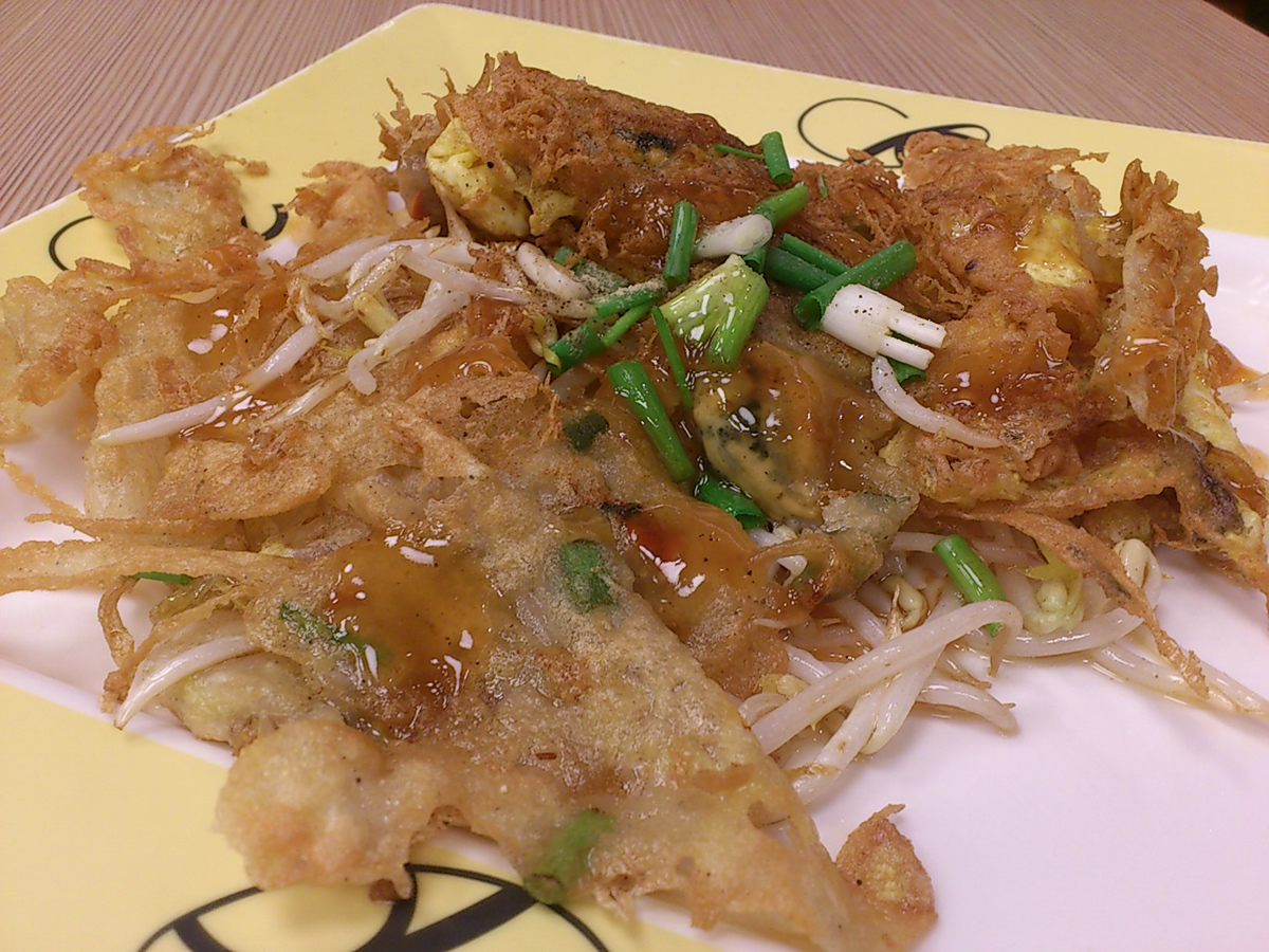 貝炒めホイトード(หอยทอด)。 小麦粉などでといた貝を鉄板でパリパリに焼き、炒めたモヤシの上に盛る。 写真はムール貝入りのホイトード。牡蠣入りのものもある。