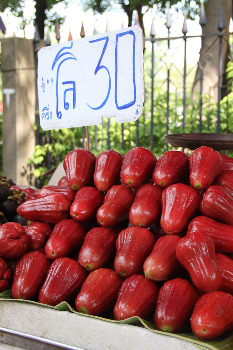 南国チョンプー(ชมพู่)。 瑞々しくてシャキシャキとしてサッパリと甘いフルーツ。 英語ではローズアップル、日本語ではレンブ(蓮霧)。