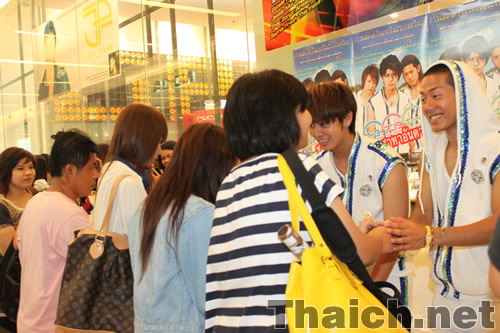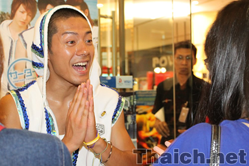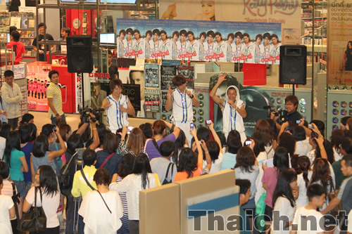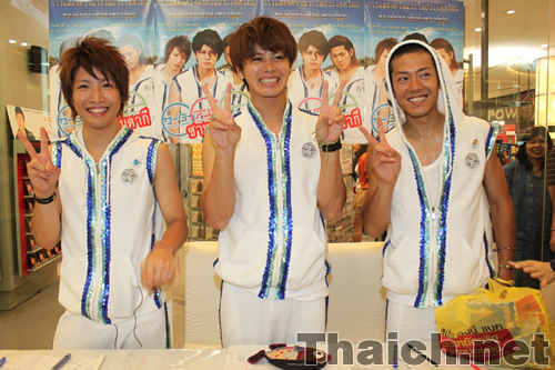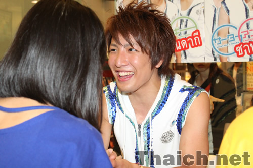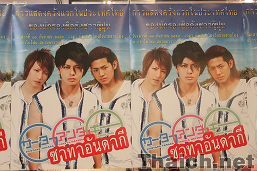 バンコク・サイアムパラゴンを訪れたサーターアンダギーの山田親太朗、松岡卓弥、森公平の三名はデビューシングル「ヤンバルクイナが飛んだ」とセカンドシングル「沖縄に行きませんか」を披露したのち、会場に集まったタイ人ファンたちとの握手会を行ないました。