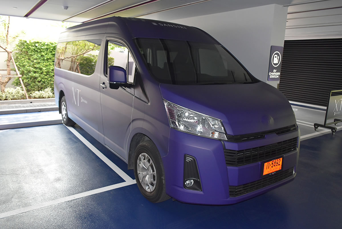 BTSエカマイ駅までは1.7キロほど、歩くと20分以上かかるのですが、物件の無料シャトルバスが用意されていました。物凄い青いでしょう!?