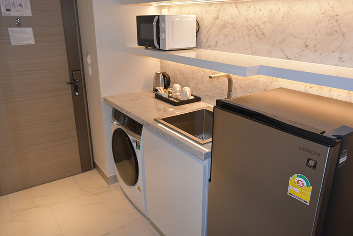 物件の名称に「ホテル」と付いていますが、どの部屋にも長期滞在の向けに(一枚扉ながら)冷蔵庫、電子レンジ、シンク、洗濯機を完備(1ベッドルーム、エグゼクティブスイート(45平米)にのみ電気コンロと換気扇が装備されています)。お部屋タイプはワンルームタイプのスタジオとサイズの異なる1ベッドルームがあり、どちらも単身者向けの間取りにて、非常にコンパクトなサイズですが、白を基調としたモダンでスタイリッシュなデザイン。ニッポンスイート(35平米)なるお部屋もございますが、寝室が小上がりになっているだけで、和の風情はあまり感じられず。収納スペースも至る所に設けられており、ウォシュレットやバスタブが付いています。ベランダは有るお部屋と無いお部屋が有りますので、内見時にチェックされて下さい。