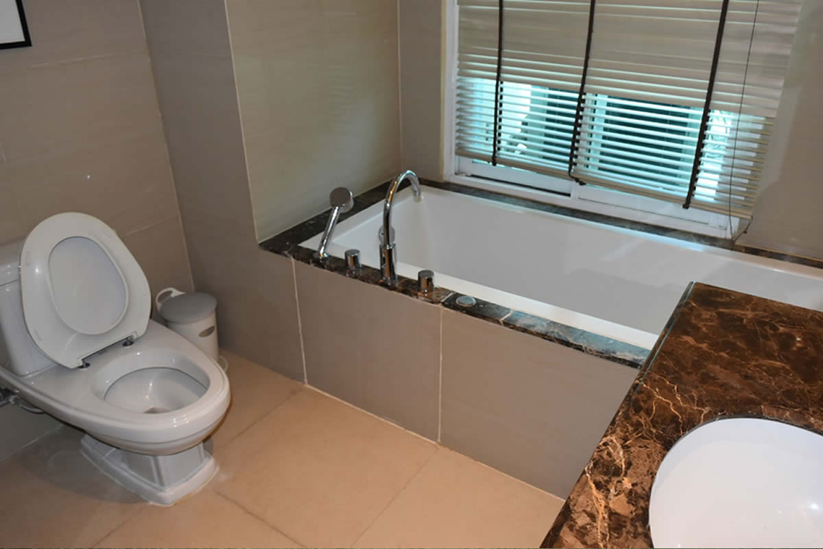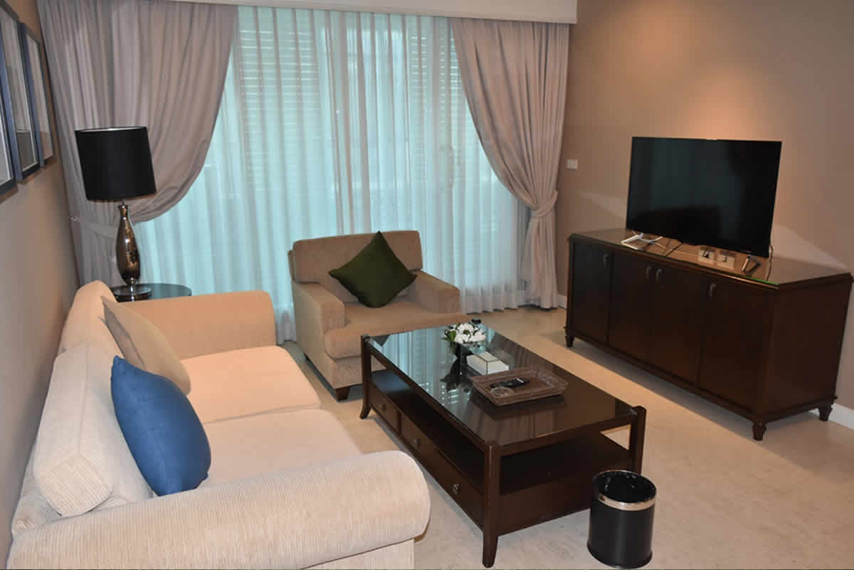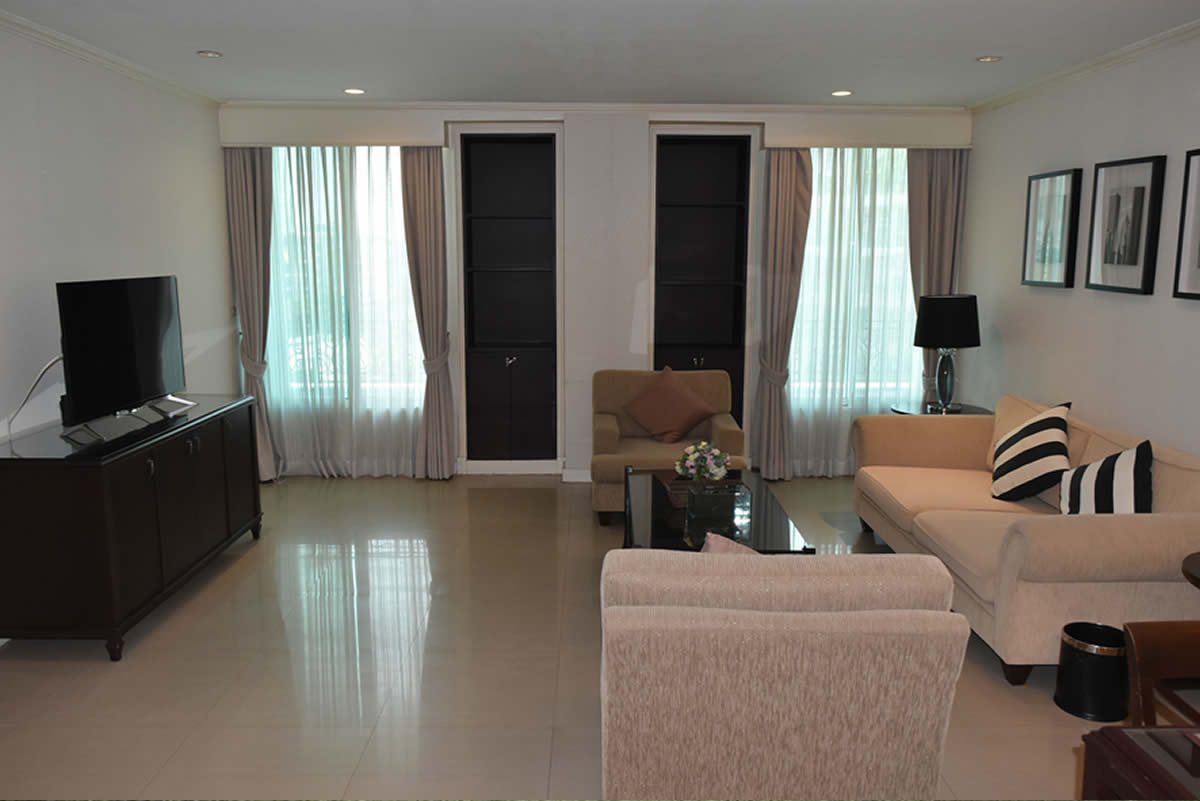 お部屋タイプ1ベッドルームが60平米、2ベッドルームが100-130平米と共に、ゆとりある間取りとなります。外観同様ヨーロッパ風のような上品な家具と内装でデコレーションされていて、高級感のある雰囲気となっています。こちらは同物件1階にショールームを持つインテリア会社を経営するオーナーさんの拘りでもある様です。低層の物件ながら、目の前のトンローソイ10が大通りにて、意外と眺望が開けています。また、以前は隣にディスコがあったため、騒音対策で二重窓に施工されています。懸念されるのは、1ベッドルームのベランダは開閉出来ない窓で覆われていて、2ベッドルームは出窓風で外に出る様には作られておりません。