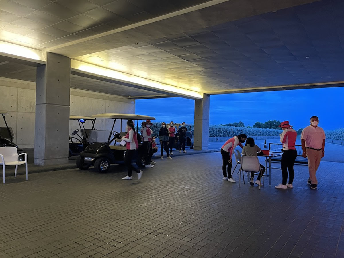 ゴルフ場に到着するとバッグドロップのところでストップ。検査会場が出来ていました。ここでまずはスタート時間と予約名の確認をされます。