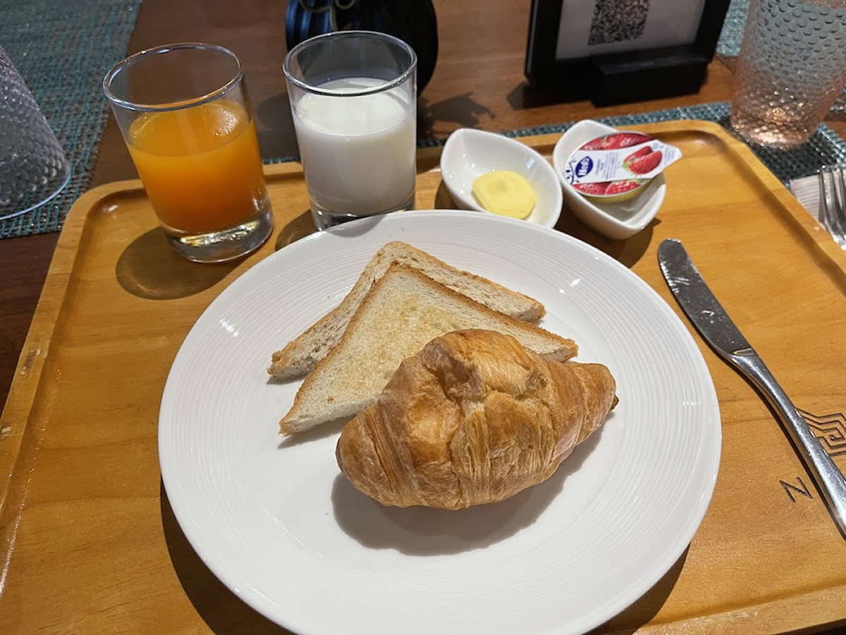 Breakfast of the day。最初にパンが出てきて(コーヒーか紅茶も付いてきます)