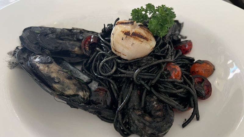 イカ墨スパ、シーザーサラダ、生ハムメロン、ちょいとお高いですがどれも美味しかったです。